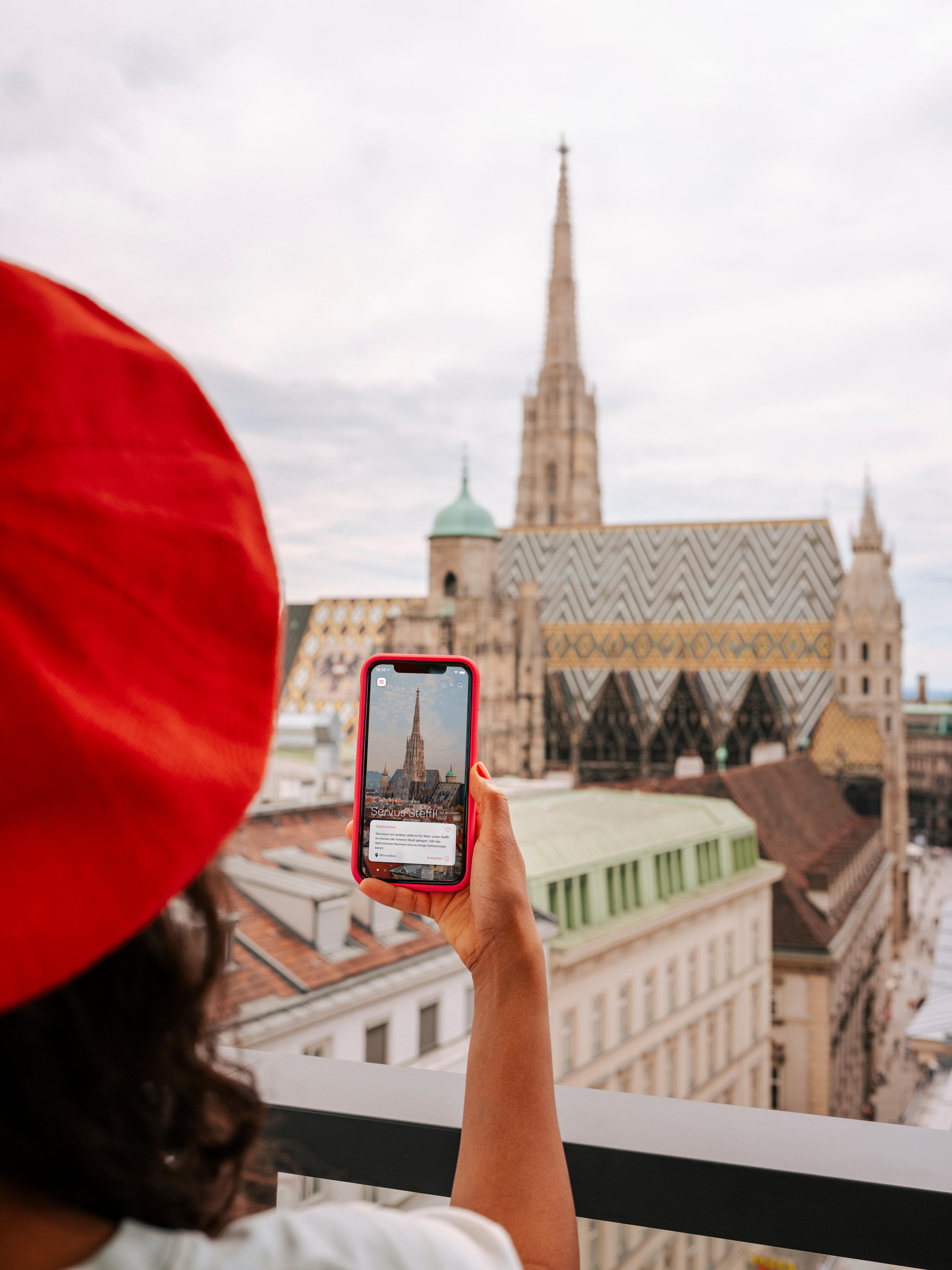 Frau mit Smartphone und Stephansdom im Hintergrund