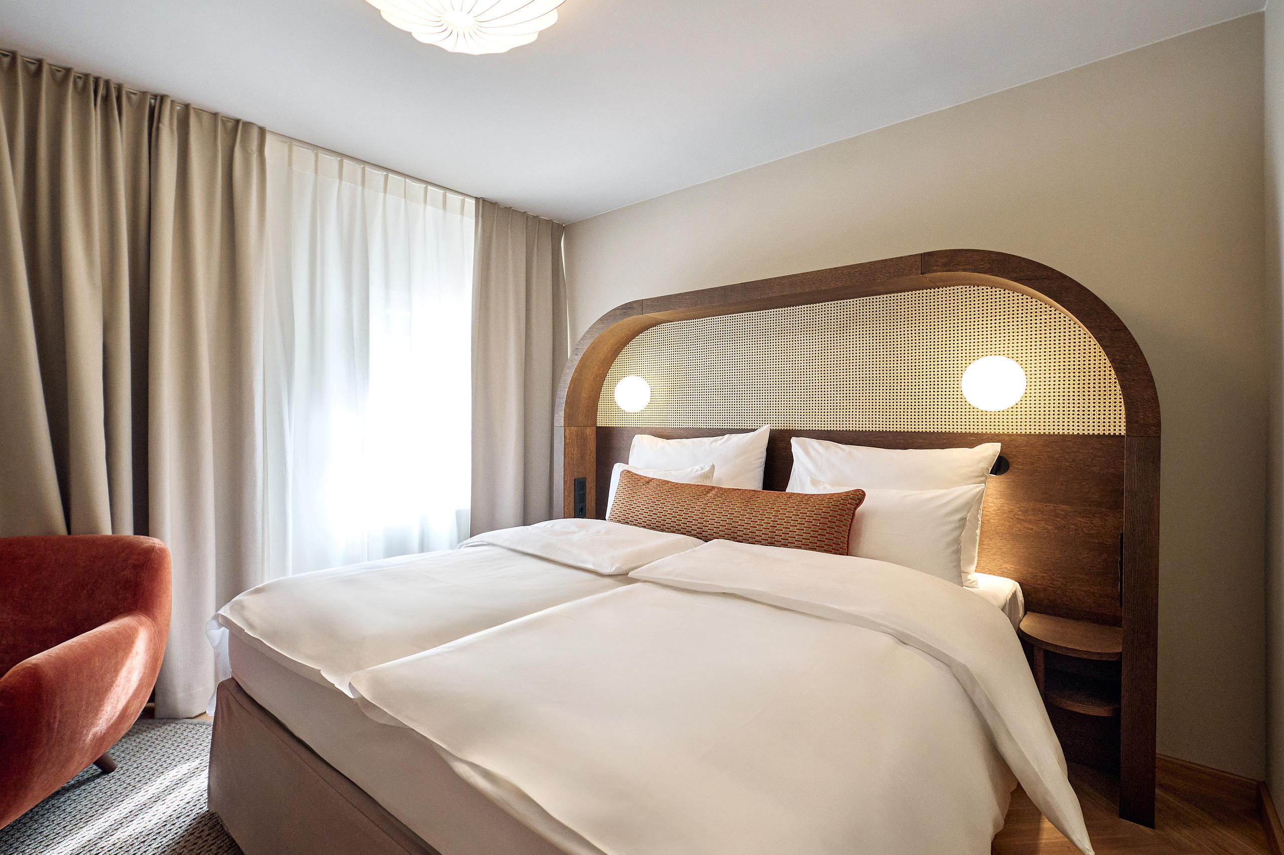 Ein helles Hotelzimmer mit einem ordentlich gemachten Doppelbett und einem hölzernen, bogenförmigen Kopfteil, warmem Licht, langen beigefarbenen Vorhängen und einem orangefarbenen Polstersessel.