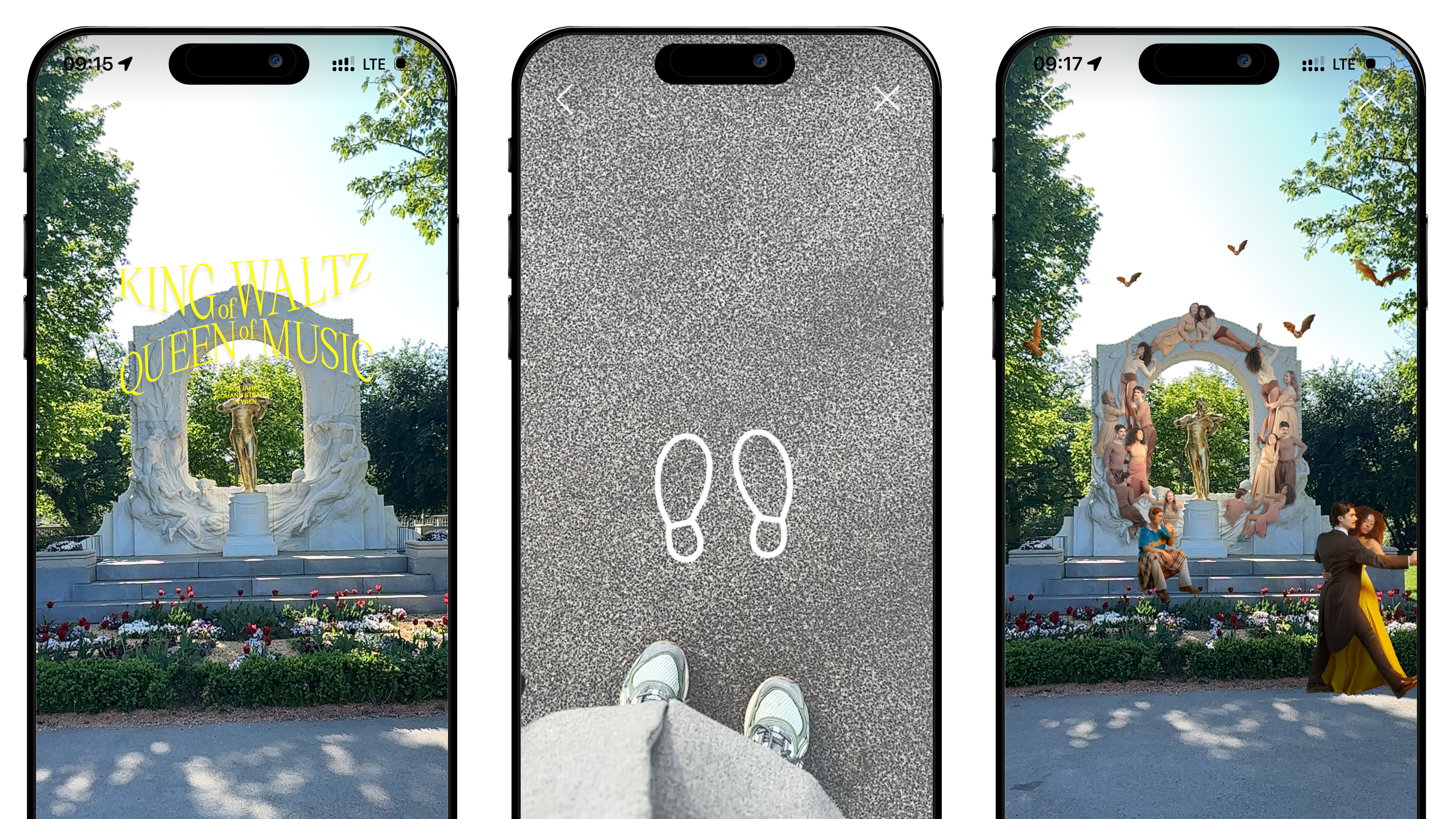 Die digitale Schitzeljagd umfasst sechs Orte, Herzstück ist das vergoldete Strauss-Denkmal im Wiener Stadtpark. An dieser ersten Station können sich User:innen mithilfe von Augmented Reality an ihren ersten Walzerschritten versuchen. ivie zeigt die Schrittabfolge vor, die nachzutanzen ist. Außerdem wird das Sujet zum Jahresmotto „King of Waltz. Queen of Music“, gestaltet von Julian Lee-Harather, in der Destinations-App visuell und akustisch zum Leben erweckt – die Figuren bewegen sich, begleitet von den Klängen des Donauwalzers.