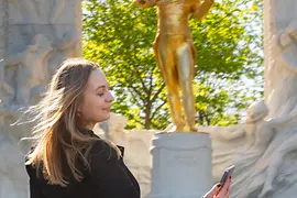 Als krönender Abschluss des AR-Specials wartet ein ganz besonderes Highlight im Stadtpark: Wer möchte, kann sein Gesicht virtuell vergolden lassen – und damit der berühmten Johann-Strauss-Statue Konkurrenz machen. Mit Kamera im Selfie-Modus bekommt das eigene Gesicht einen goldenen Anstrich. Die Aufgabe ist optional zur Gamification-Challenge und es gibt dafür keine Punkte. Mit einem Klick auf den Auslöse-Button lässt sich dieser Moment als Foto festhalten. Das Bild ist versehen mit dem Kampagnen-Motto und kann anschließend direkt heruntergeladen, per E-Mail verschickt oder auf Social Media geteilt werden.