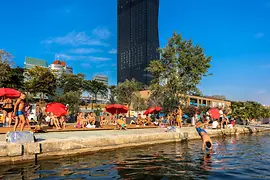 Die Badestrände an der Neuen Donau sind für Wiener:innen und Wien-Gäste eine einzigartige Freibad-Alternative. Nicht nur an den Sandstränden, sondern auch an vielen Stellen entlang des Ufers ist der Einstieg sowie ein Sprung ins Wasser möglich und das Baden sicher.