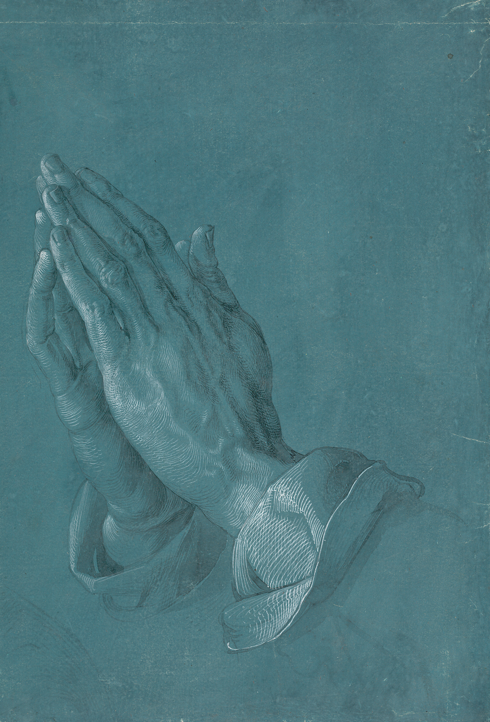 Detailed drawing of folded praying hands against a blue background.